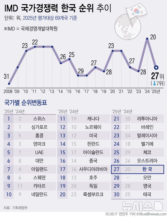 IMD가 17일 발표한 '2025년 국가경쟁력 평가 결과'를 보면 우리나라는 올해 평가에서 경제성과(16→11위)와 정부효율성(39→31위) 순위는 상승했으나, 기업효율성(23→44위)과 인프라(11→21위)는 순위가 하락해 27위에 그쳤다.
