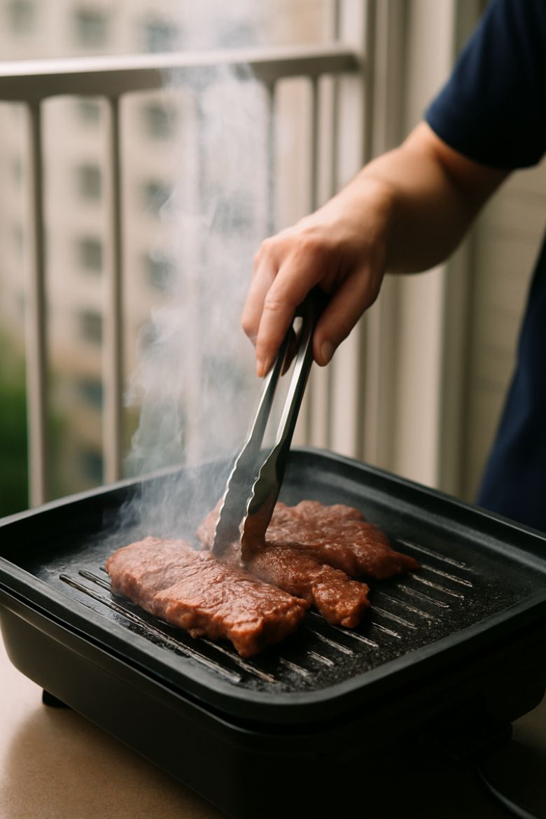 공동주택 베란다에서 고기를 구워 먹는 행동을 두고 온라인에서 엇갈린 의견이 오가는 상황을 AI로 구성한 이미지. /사진=챗GPT |