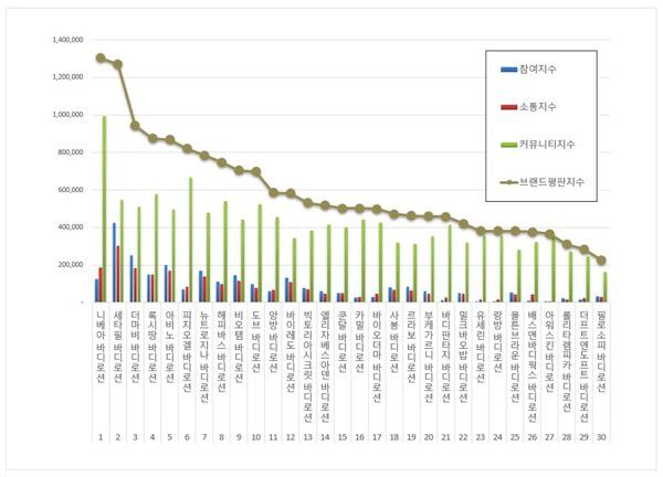 3위, 더마비 바디로션 브랜드는 참여지수 250,327 소통지수 182,391 커뮤니티지수 510,244가 되면서 브랜드평판지수 942,963으로 분석됐다. 지난 5월 브랜드평판지수 1,030,270과 비교해보면 8.47% 하락했다.