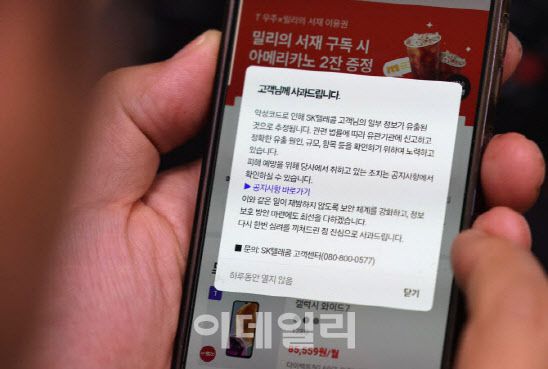 [이데일리 노진환 기자]4월 22일 한 시민이 SK텔레콤이 T월드 앱에 게시한 정보 유출 사고 관련 사과 안내문을 읽고 있다.