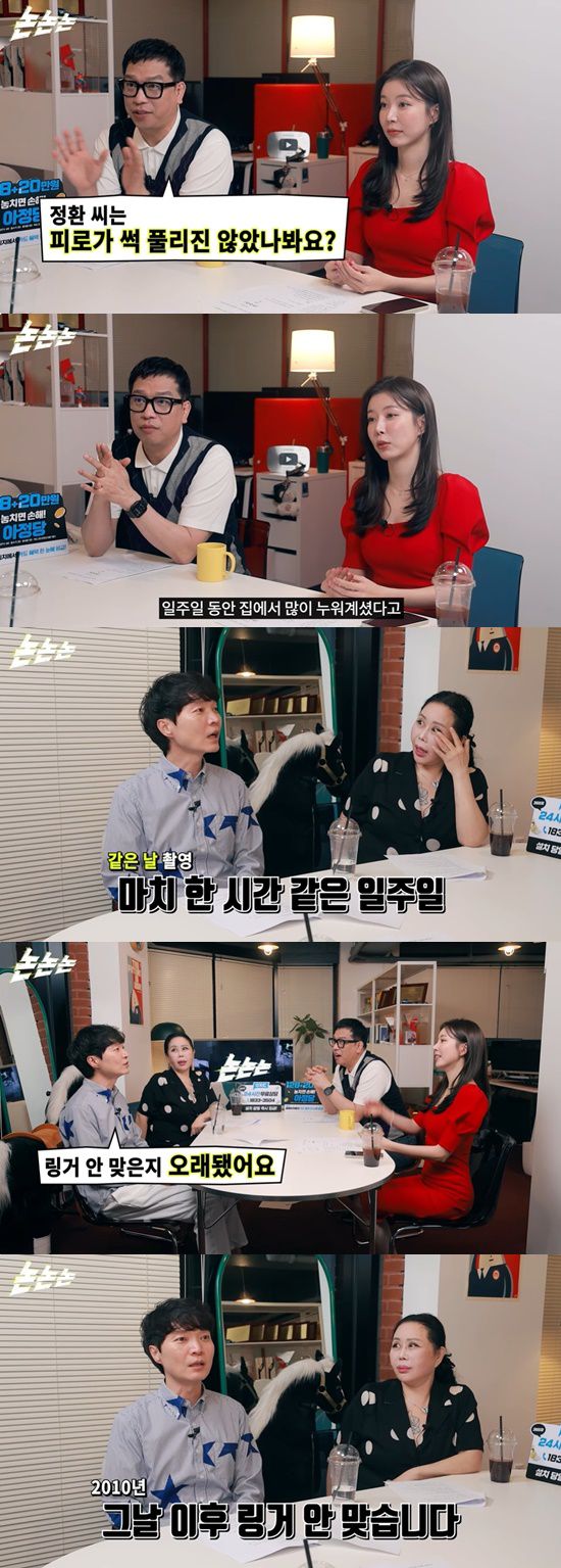 공개된 영상에서 강병규는 "정환 씨는 지난주부터 피로가 썩 풀리진 않았나보다"라고 말했고, 장혜리는 "일주일 동안 집에서 많이 누워계셨다고 (들었다)"고 농담했다.