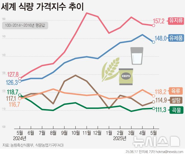 [서울=뉴시스] 세계 식량가격지수가 넉 달만에 하락세로 전환했다. 육류와 유제품 가격이 올랐지만 곡물, 유지류와 설탕 가격이 하락했다. 미국의 2025년 옥수수 수확량이 사상 최대치를 기록할 것으로 전망됨에 따라 옥수수 가격이 급격히 하락했다.