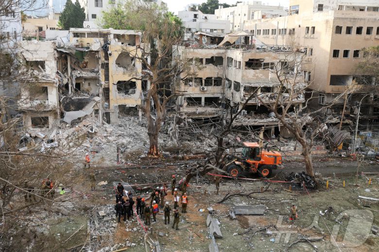 16일 이란이 이스라엘 텔아비브를 향해 미사일이 발사한 후 긴급 구조대가 손상된 건물에 출동해 있다. 2025.6.16 ⓒ 로이터=뉴스1 ⓒ News1 강민경 기자 |