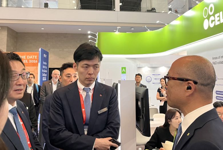 16일(현지시간) 신유열 롯데지주 미래성장실장(부사장)이 미국 보스턴에서 열린 2025 바이오 USA에서 셀트리온 부스를 방문, 관계자의 설명을 듣고 있다.