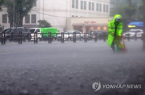 비 내려도 묵묵히(서울=연합뉴스) 신현우 기자 = 16일 폭우가 쏟아진 서울 서대문구에서 환경미화원이 인도를 청소하고 있다. 2025.6.16 nowwego@yna.co.kr