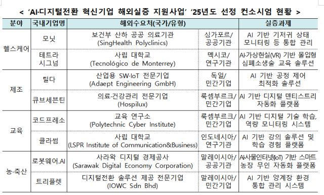 선정평가에는 해외 수요처 관계자 및 외부 전문가 등이 참여해 지원기업들이 제시한 과제별 실증 적합성과 사업화 가능성 등을 종합적으로 심사했다. 유럽·북중미·아시아 등 다양한 지역의 공공기관(디지털 경제공사, 의료기관)·대학·민간기업을 아우르는 수요처와 국내기업을 연계한 이하 8개 컨소시엄이 최종 선정됐다.
