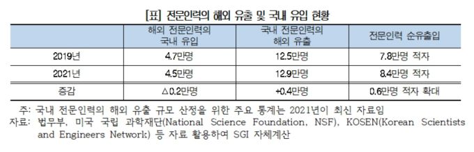 SGI는 전문 인력의 해외유출 및 국내유입 현황과 관련해 "2019년 12만5000명이던 해외 유출 전문 인력은 이용 가능한 가장 최신 자료인 2021년에 12만9000명으로 4000명 증가한 반면, 같은 기간 국내로 유입된 외국인 전문 인력은 4만7000명에서 4만5000명으로 감소했다"며 "이에 따라 두뇌수지 적자도 2019년 7만8000명에서 2021년 8만4000명으로 확대됐다"고 설명했다.