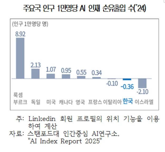 대한상의 SGI는 17일 발표한 '한국의 고급인력 해외유출 현상의 경제적 영향과 대응방안' 보고서에서 "한국의 2024년 기준 우리나라의 인구 1만명당 AI 인재 순유출은 –0.36명으로, OECD 38개국 중 35위로 최하위 수준"이라며 "이는 룩셈부르크(+8.92명), 독일(+2.13명), 미국(+1.07명) 등 주요 선진국과 뚜렷한 대조를 이룬다"고 밝혔다.