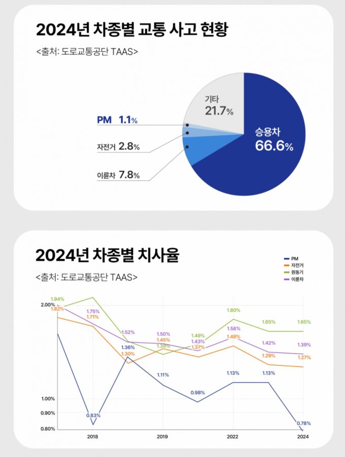 한편, 지난해 PM 가해 교통사고 2232건은 전체 교통사고 중 1.1%의 비율이다. 같은 기간 자전거 사고는 5571건(2.8%), 이륜차 사고는 1만5290건(6.7%), 승용차 사고는 약 13만 건(66.6%)을 기록했다. 협회는 "일부에서 제기되는 과도한 사고 비중 인식과는 거리가 멀다"고도 평가했다.