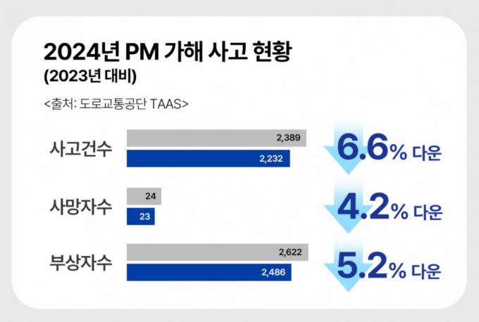한국퍼스널모빌리티산업협회는 17일 한국도로교통공단의 2024년 교통사고분석시스템(TAAS) 통계를 분석한 결과 2024년 PM의 가해사고는 2232건으로 전년(2389건)대비 6.6% 가소한 것으로 나타났다.