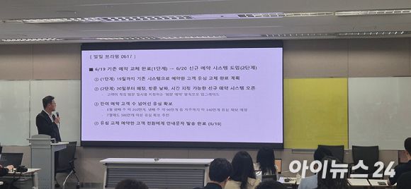 김희섭 SK텔레콤 PR 센터장이 17일 중구 삼화타워에서 열린 SKT 사이버 침해 사고 일일 브리핑에서 설명을 하고 있다. [사진=서효빈 기자]