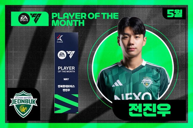 [인터풋볼] 신동훈 기자 = 전북현대모터스 전진우가 K리그 공식 비디오게임 파트너 일렉트로닉아츠(Electronic Arts, 이하 'EA')가 후원하는 2025년 5월 'EA SPORTS 이달의선수상(EA SPORTS Player Of The Month)'을 수상했다. 지난 4월에 이어 2회 연속 수상이다.
