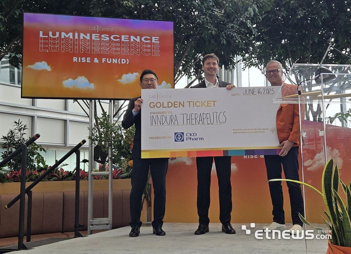 16일(현지시각) 미국 보스턴에서 열린 '2025 CKD Pharm Golden Ticket' 행사에서 (왼쪽부터) 김영주 종근당 대표와 InnDura Therapeutics CEO Nikola Ivica, 랩센트럴 CBO Mike Larhette가 기념촬영을 하고 있다. |