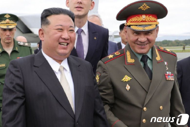 김정은 북한 국무위원장이 16일(현지시각) 러시아 연해주 블라디보스토크에 있는 크네비치 군 비행장을 세르게이 쇼이구 국방장관과 방문을 하고 있다. 2023.9.17 ⓒ AFP=뉴스1 ⓒ News1 우동명 기자 |