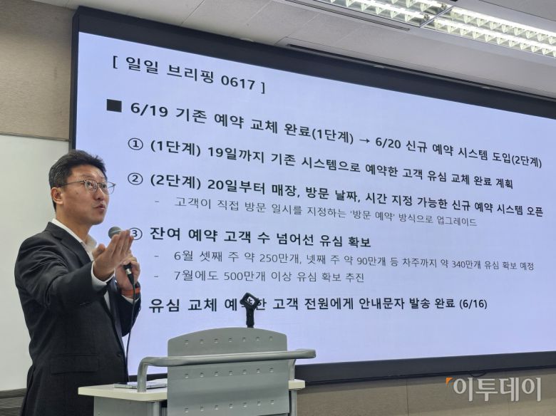 한편, SKT는 이번 주까지 예약자 전원에 대한 유심 교체를 완료한다는 방침이다. 이날 기준 누적 유심 교체 이용자 수는 840만 명이었다. 잔여 예약 고객은 153만 명으로 집계됐다. 김희섭 PR 센터장은 "(유심 교체를) 예약했는데 오지 않은 분이 58만 명 정도 된다"며 "이분들을 제외하면 (잔여 예약자 수가) 약 95만 명 정도 된다"고 말했다. 이어 김 센터장은 "19일 목요일이면 (예약자에 대한 유심 교체를) 완료할 것"이라고 했다.