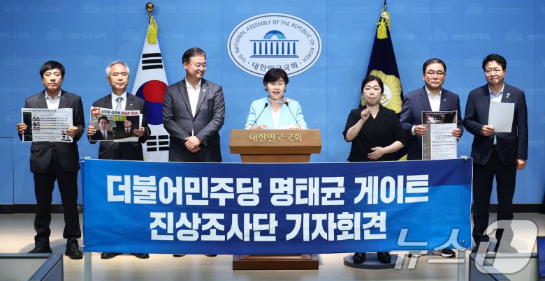 더불어민주당 명태균게이트 진상조사 서영교 단장을 비롯한 의원들이 17일 오전 서울 여의도 국회 소통관에서 심우정 검찰총장이 명태균 게이트 수사 당시 김주현 전 대통령실 민정수석과 비화폰으로 통화한 것과 관련한 기자회견을 하고 있다. 2025.6.17/뉴스1 ⓒ News1 김민지 기자