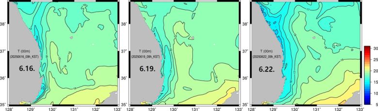 16일 오전 9시 현재 동해안 수온은 강릉 19.2도, 삼척 16.0도, 울진 나곡 14.7도, 울진 온양 13.9도, 영덕 16.9도, 포항 하정 16.5도, 울산 진하 14.4도, 울산 간절곶 12.6도, 부산 고리 14.4도, 부산 장안 14.5도, 부산 기장 13.8도 등이다.