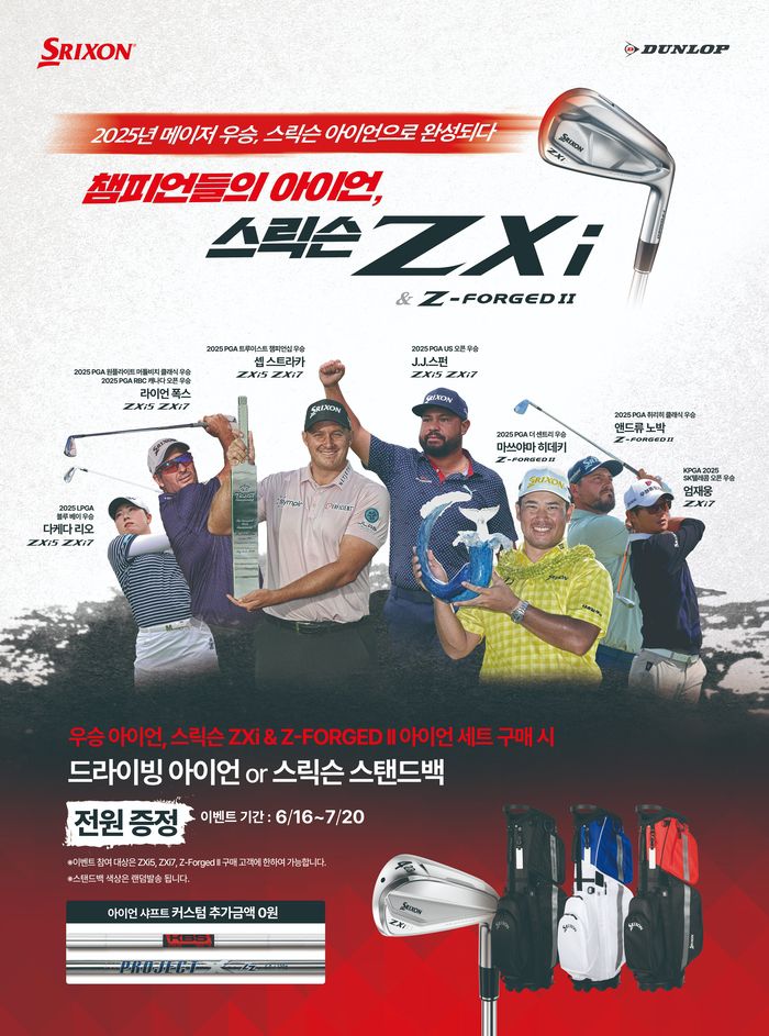 ‘US 오픈’의 우승을 기념하는 사은 프로모션 답게 구성도 알차다. 프로모션의 사은품으로는 30만원 상당의 신제품 ZXi드라이빙 아이언 또는 스릭슨 스탠드백이 제공되어 퍼포먼스와 실용성을 고민하는 구매 고객 니즈에 맞춰 옵션을 선택할 수 있다.