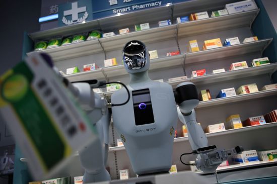 베이징 휴머노이드 로봇 혁신 센터의 모의 약국에서 약 상자를 들고 있는 로봇. EPA연합뉴스.