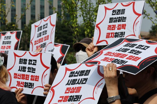 지난해 8월23일 정신장애 당사자 단체·가족단체 등 시민단체가 서울 여의도 국회의사당 앞에서 정신병원개혁연대 출범 기자회견을 열어 격리·강박 금지 등의 정신건강정책 전환을 촉구하고 있다. 백소아 기자 thanks@hani.co.kr