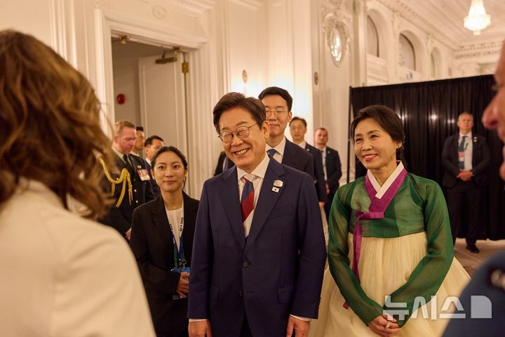 [캘거리(캐나다)=뉴시스] 김지은 기자 = 주요 7개국(G7) 정상회의 참석을 위해 캐나다를 방문 중인 이재명 대통령은 일정 첫날인 16일(현지시간) 부인 김혜경 여사와 함께 다니엘 스미스 캐나다 앨버타주 수상이 주최하는 환영 리셉션에 참석했다.