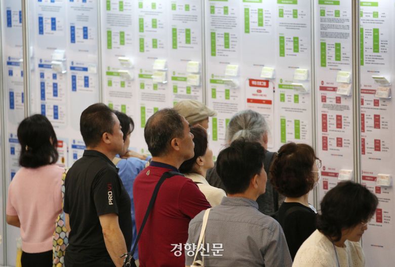 구직자들이 지난해 7월22일 서울 중구 동대문디자인플라자(DDP)에서 열린 2024년 서울 중장년 일자리박람회에서 채용공고 게시판을 살펴보고 있다. 권도현 기자