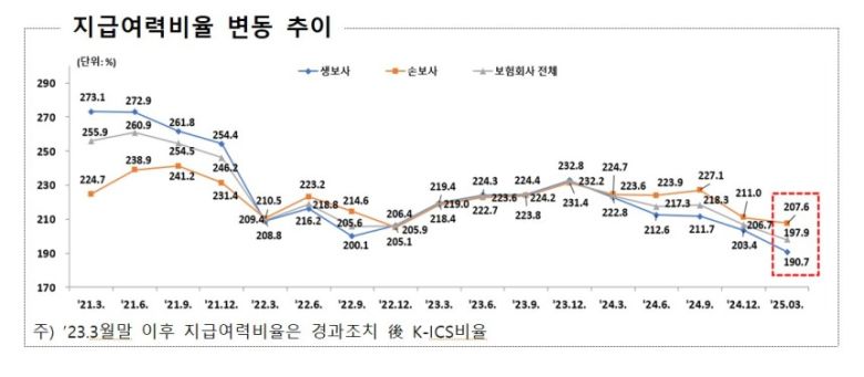 보험사 지급여력비율 변동 추이. 금융감독원 제공 |