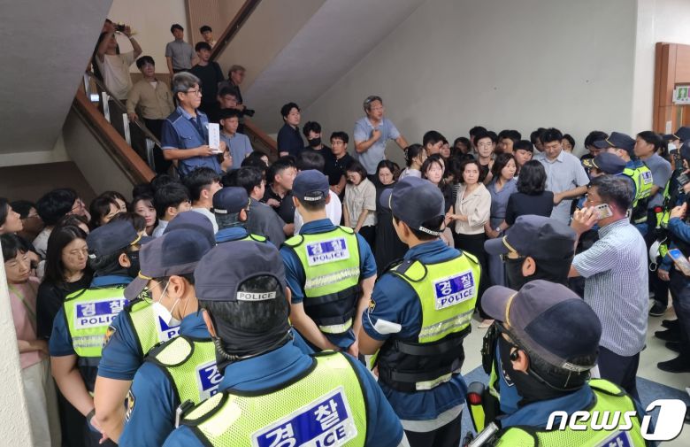(청주=뉴스1) 박건영 기자 = 충북 청주시가 오송 지하차도 참사 희생자 시민 분향소를 기습 철거한 데 반발해 시청 문을 부수고 안으로 난입한 시민단체 관계자들이 법원의 선처를 받았다.
