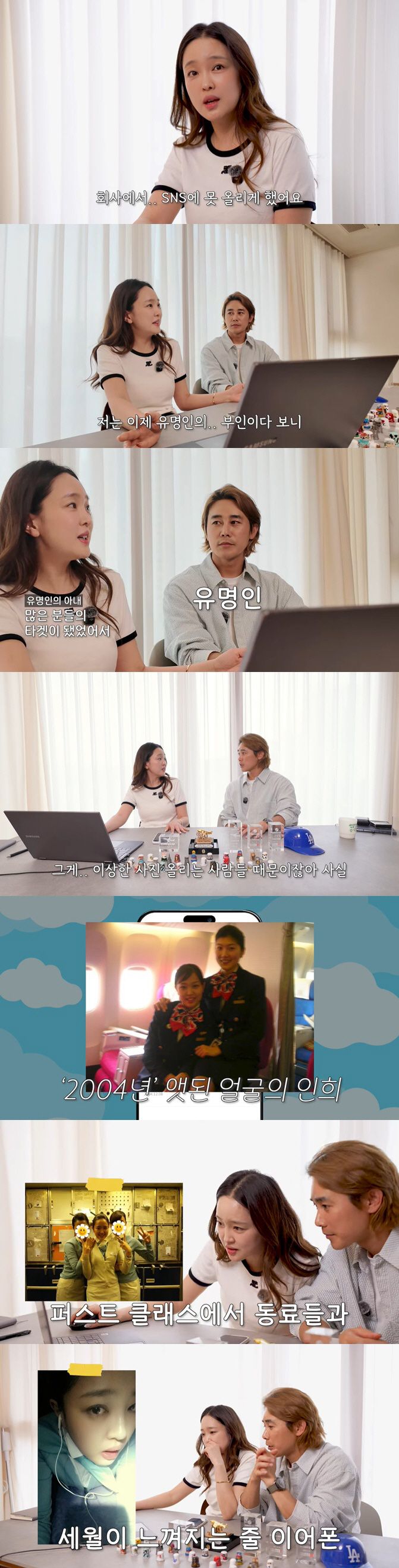 장인희는 "유니폼을 입고 많이 찍긴 했는데, 회사에서 SNS에 못 올리게 했다. 워낙 승무원들이 많아서 일일히 다 통제는 못했지만.. 특히 저는 유명인(정태우)의 아내다 보니 많은 분들의 타켓이 됐어서 최대한 자제를 했다"고 당시 고충을 털어놨다.