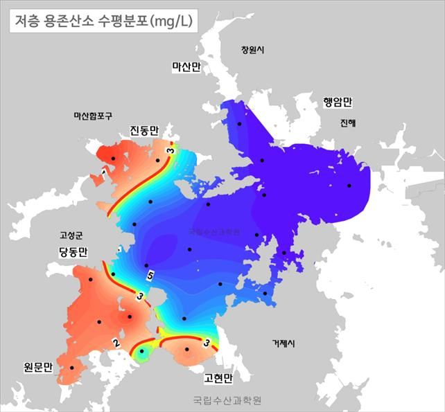 국립수산과학원은 진해만 서부해역이 여름철 산소부족 물덩어리가 발생하기 쉬운 환경으로 변화하고 있다고 17일 밝혔다.