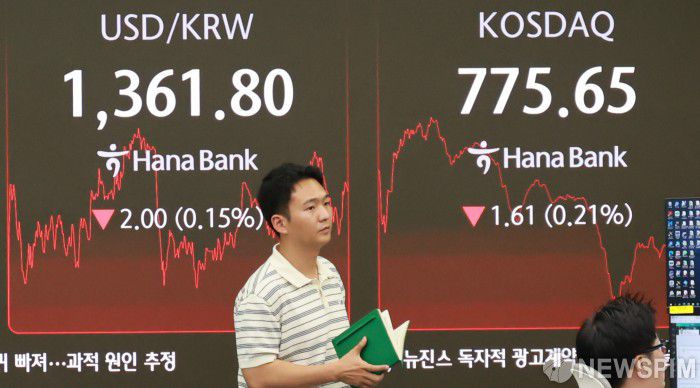 [서울=뉴스핌] 양윤모 기자 = 17일 오후 코스피가 전장 종가보다 3.46 포인트(0.12%) 상승하며 2,950.30으로, 코스닥은 1.61 포인트(0.21%) 하락한 775.65로 마감한 가운데, 서울 중구 하나은행 딜링룸에서 직원들이 업무를 보고 있다. 서울외환시장에서 원·달러 환율은 전장 대비 2.00원 하락한 1,361.80원에 거래를 마감했다. 2025.06.17 yym58@newspim.com
