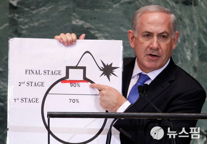 2012년 9월 27일(현지시간) 유엔 총회에서 이란의 핵 무기 프로그램에 대해 발언하는 베냐민 네타냐후 이스라엘 총리의 모습. [사진=로이터 뉴스핌]