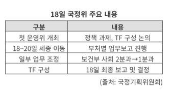 출범 후 첫 운영위 개최 정책 과제, TF 구성 논의 18~20일 부처 업무보고 "TF 구성 18일 최종 보고"