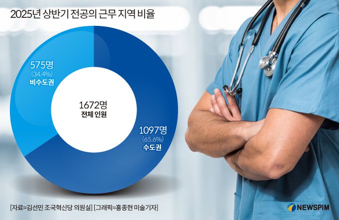 국회 보건복지위원회 소속 김선민 조국혁신당 의원실이 복지부에서 받은 자료에 따르면, 올해 상반기 전국 전공의 1672명 가운데, 1097명(65.6%)이 수도권 병원에서 근무하는 것으로 집계됐다. 비수도권 병원 소속 575명(34.4%)보다 2배 가까이 많은 수치다.