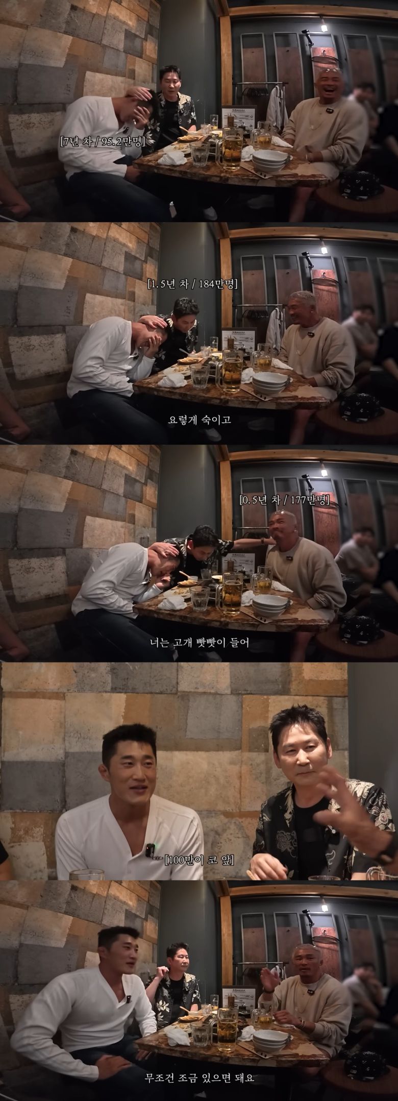 이에 184만 구독자의 신동엽은 "그럼 이제 많이 숙이고 난 1년 반 됐으니 조금 숙이겠다"며 유튜브 시작 6개월 만에 180만 명을 달성한 추성훈에겐 "넌 고개 빳빳이 들어라"라고 짚었다.