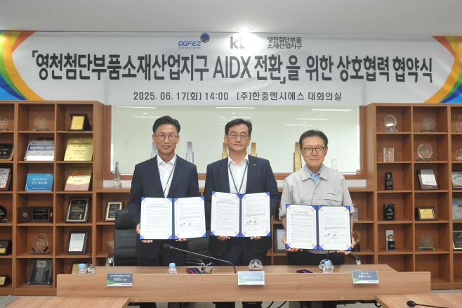 영천첨단부품소재산업지구 입주기업협의회는 17일 영천첨단부품소재산업지구 내 한중엔시에스(대회의실, 2층)에서 AIDX 전환을 위한 KT 대구경북광역본부와 업무협약(MOU)을 체결했다.