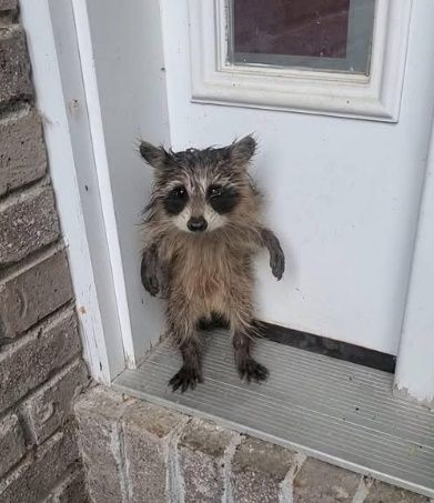 미국의 한 주택 현관문 앞에 비에 홀딱 젖은 채 두 발로 서 있는 새끼 라쿤의 모습이 공개돼 전세계인들의 시선을 사로잡았다.