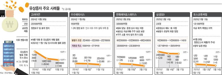 올해 들어서만 10조원이 넘는 유상증자 소식에 주가 하락 피해는 고스란히 개미투자자들의 몫이 됐다. 특히 한화에어로스페이스, 삼성SDI, 포스코퓨처엠 등 코스피 시장에서 영향력이 있는 주요 기업 3곳이 '조 단위'의 대규모 유상증자 계획을 발표하며 손실은 더욱 커졌다. 금융감독원이 주주권익 훼손 우려가 있는 유상증자 건에 대해 칼을 빼 들었음에도 개미들의 피해를 야기시키는 행태는 여전히 진행 중이다.