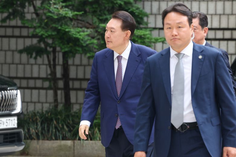 윤석열 전 대통령이 16일 서울 서초구 서울중앙지방법원에서 열린 내란 우두머리 혐의·직권남용 권리행사 방해 혐의 사건 7차 공판에 출석하고 있다. [연합] |