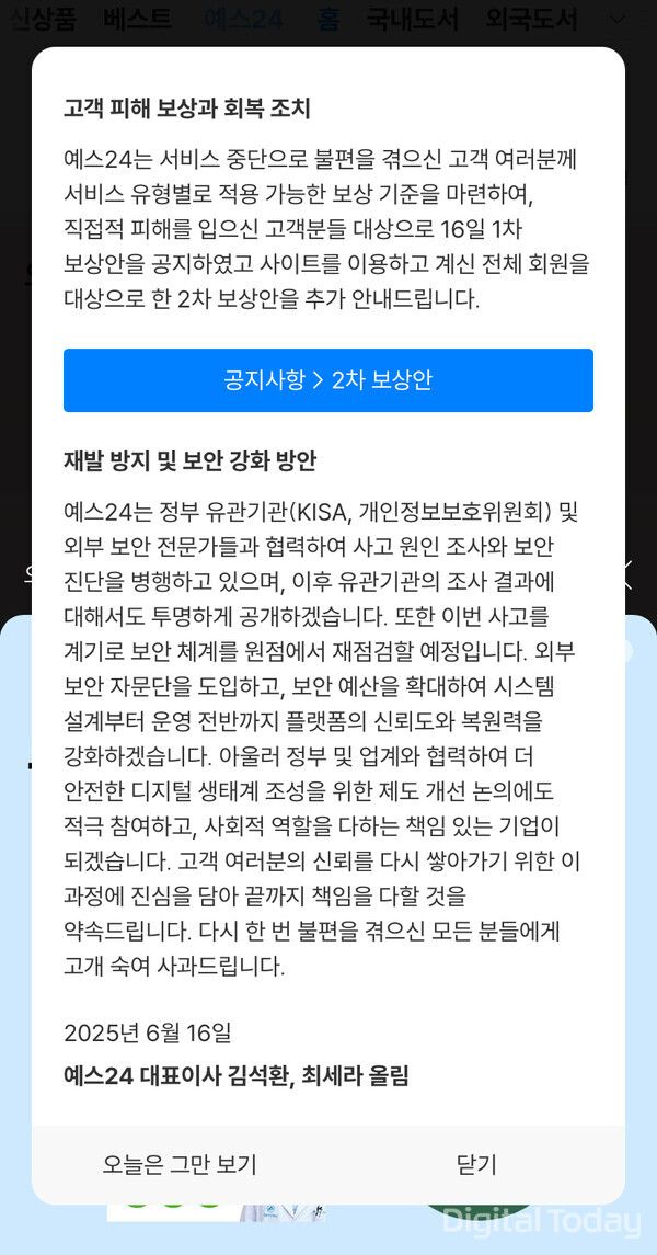 [디지털투데이 손슬기 기자] 도서 플랫폼 예스24가 최근 발생한 랜섬웨어 감염에 따른 서비스 장애와 관련해 2차 보상안을 17일 공개했다.