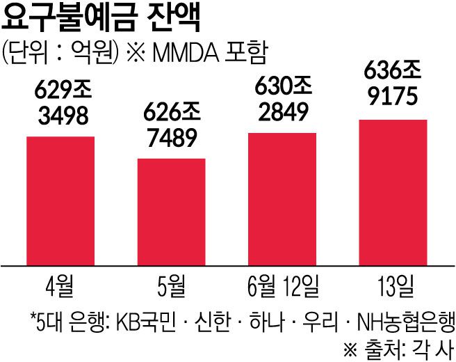 17일 금융권에 따르면 5대 시중은행(KB국민·신한·하나·우리·NH농협)의 요구불예금(MMDA 포함) 잔액은 13일 기준 636조9175억 원으로 전날인 12일(630조2849억 원)보다 6조6326억 원 증가했다. 요구불예금이 하루 만에 6조 원 넘게 늘어난 것은 이례적이다.