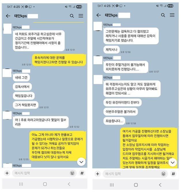 김씨는 작업절차 무시에 대해 한전케이피에스에 항의하기도 했다. 2022년 8월 한전케이피에스는 김씨에게 “외주 가공 하고 싶은데 너무 긴급 건이고 주말에 시간적 여유가 (없다)”며 작업을 요청했다. 김씨는 품질문제가 발생할 우려 때문에 작업하기 어렵다는 취지로 답변했지만, 한전케이피에스 직원은 “감독사에서 책임질 것”, “감독하고 다 협의했다”며 작업을 요청했다. 이에 김씨는 “가공을 진행한다면 (한국파워오엔엠) 소장님을 통해서 업무절차에 따라 진행하면 된다”며 “전 소장님 업무지시에 따라 작업하는 입장”이라고 밝혔다.