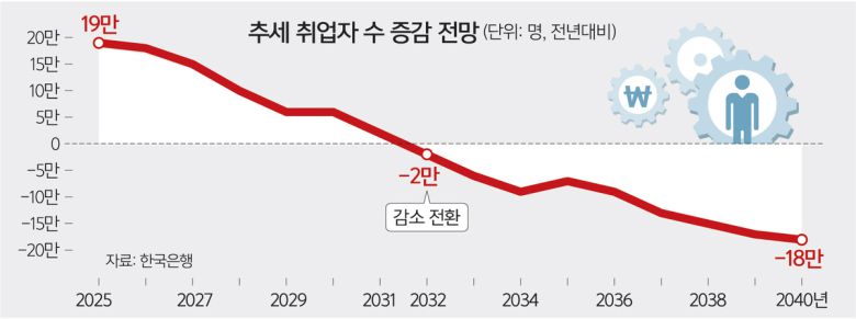 7년 뒤인 2032년부터 우리나라 추세 취업자 수가 ‘마이너스’로 전환할 것이라는 한국은행의 분석이 나왔다. 지금까지는 불경기 때 고용시장이 얼어붙으면서 취업자 수가 줄었지만, 앞으로는 경기의 좋고 나쁨과는 별개로 고령화 등 인구구조 변화만으로도 실제 취업자 수가 감소할 수 있다는 의미다.