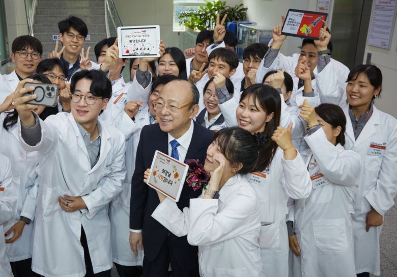 김승연 한화그룹 회장(가운데)이 17일 한화토탈에너지스 연구소를 방문해 연구원들과 함께 사진을 찍고 있다. 한화그룹 제공