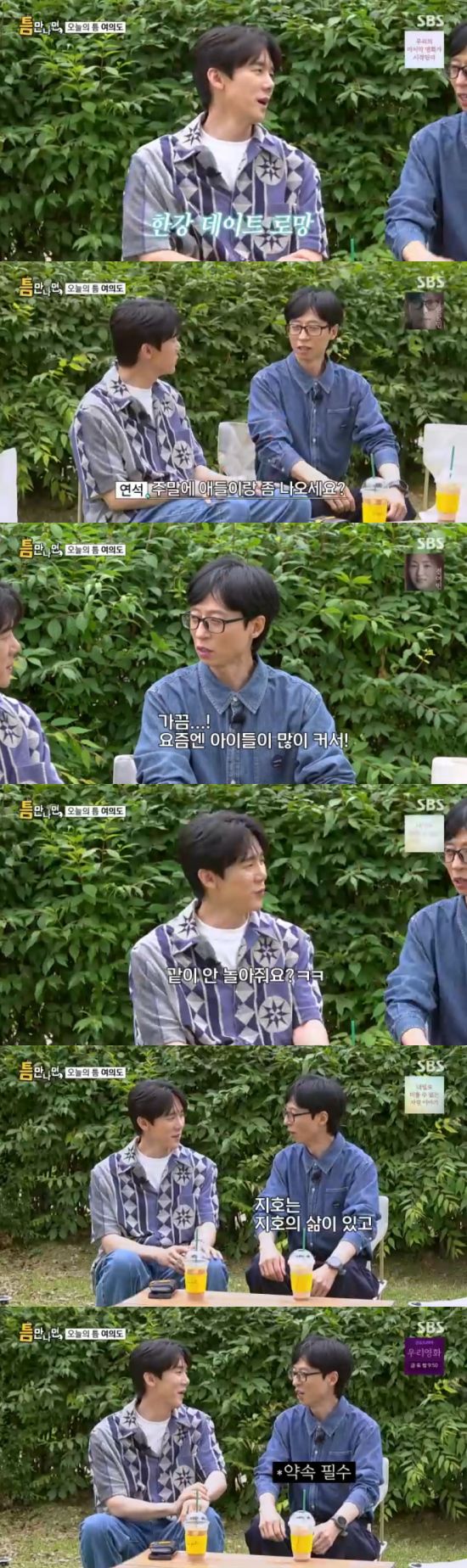 유재석은 유연석에게 "너는 여자친구가 생기면 한강 데이트를 하고 싶다고 하지 않았냐"고 했고, 유연석은 "한강 데이트 로망이 있다. 또 아이들과 함께 오고 싶기도 하다"고 바람을 드러냈다.