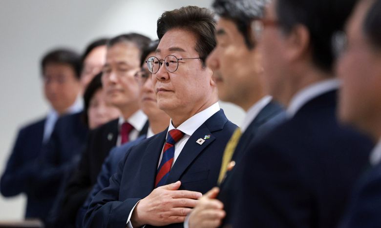이재명 대통령이 지난 5일 서울 용산구 대통령실 청사에서 열린 국무회의에서 국기에 경례를 하고 있다. 뉴시스 |