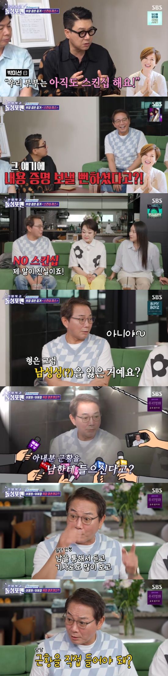 이에 이봉원은 "없는 얘기를 하니까"라면서 "내 말이 진실이다. 그렇다고 남성성을 잃은 건 아니다. 아직까지는 괜찮다"고 했다. 김준호는 "미선 누나와 마지막 키스는 언제냐"고 궁금해했고, 이봉원은 "그런 거 하지마. 있을 수 없는 일이다. 뽀뽀도 마찬가지"라고 질색했다.