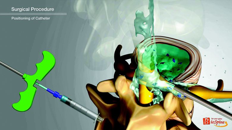 “추간공확장술은 크게 두 단계로 구성된다. 1단계에서는 꼬리뼈 접근법(in-out)으로 천추열공이라는 구멍을 통해 경막외 카테터를 진입해 1차로 병변 부위에 통증 완화 약물을 전달하고 플라스틱 관의 물리적인 힘으로 유착 부위를 박리한다. 2단계는 추간공 접근법(out-in)으로 특수 키트를 옆구리 방향에서 추간공으로 접근해 추간공 내·외측의 인대를 절제해 공간을 넓혀주는 방식으로 유착된 부위를 집중 공략한다. 즉 두 단계에 걸쳐서 양방향으로 유착 부위를 집중 박리하므로 추간공 깊숙이 숨어 있는 유착도 정밀하게 치료 가능하다.”