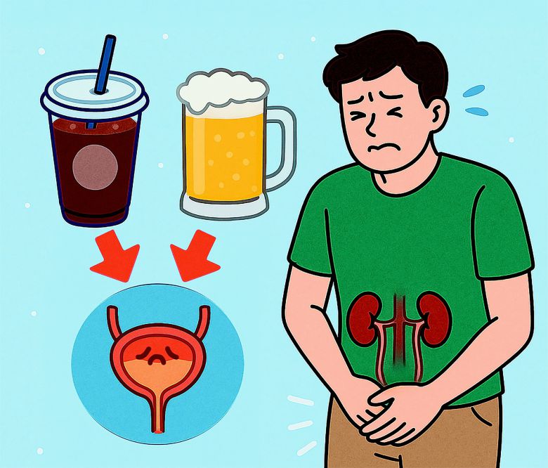 알코올은 이뇨 작용을 유도해 배뇨 빈도를 증가시키고 방광을 자극해 소변을 자주 보게 만든다. 동시에 전립선 주변 조직의 염증을 유발하거나 심화시킬 수 있어 전립선비대증 환자에게는 치명적이다. 카페인 역시 이뇨 작용과 방광 자극을 일으키는 주범이다. 커피, 에너지 음료, 탄산음료 등 카페인이 포함된 음료는 소변 배출을 촉진하면서 방광의 잔뇨감을 악화시키고 야간뇨 발생 빈도를 높인다. 이러한 자극은 반복될수록 급성 요폐와 같은 합병증의 위험을 높인다. 급성 요폐는 방광의 과도한 수축과 근육 피로로 인해 소변 배출이 갑작스럽게 차단되는 상태로 방치할 경우 방광 벽 손상이나 신장 기능 저하로 이어질 수 있다. 또한 요로에 잔류하는 소변은 세균 번식을 촉진해 방광염이나 요로 감염을 유발할 가능성을 높인다. 감염이 심해지면 신우신염이나 패혈증 같은 중증 합병증으로 발전할 위험도 있다.