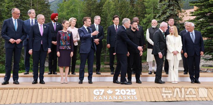 [카나나스키스(캐나다)=뉴시스] 최진석 기자 = 이재명 대통령이 17일(현지시간) 캐나다 앨버타주 카나나스키스 주요 7개국(G7) 정상회의장에서 의장국 마크 카니 캐나다 총리, 초청국 정상들과 함께 기념촬영을 준비하고 있다. 2025.06.18. myjs@newsis.com